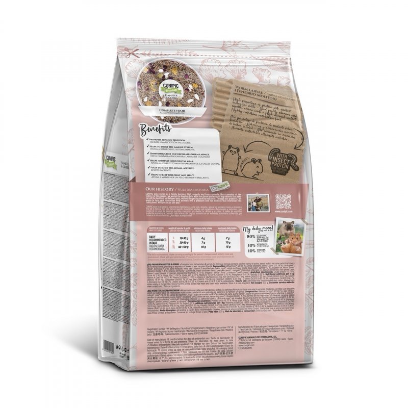 Cunipic 優質倉鼠和沙鼠食品是滿足囓齒動物營養需求的絕佳選擇。這種完整且均衡的食品採用蠕蟲幼蟲配製而成,是優質蛋白質和其他必需營養素的額外來源,可確保您的寵物的整體健康。此外,食品有助於增強免疫系統,促進健康消化,預防囓齒動物常見的胃腸道問題,且有助於保持寵物的毛髮絲滑和光澤。不含人工色素和防腐劑,是您寵物飲食的更健康、更安全的選擇。